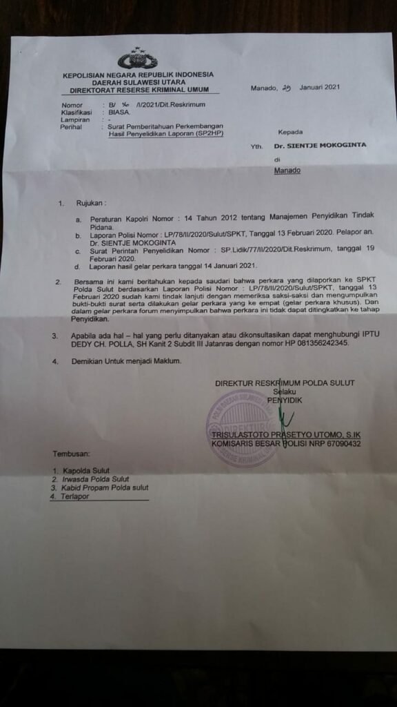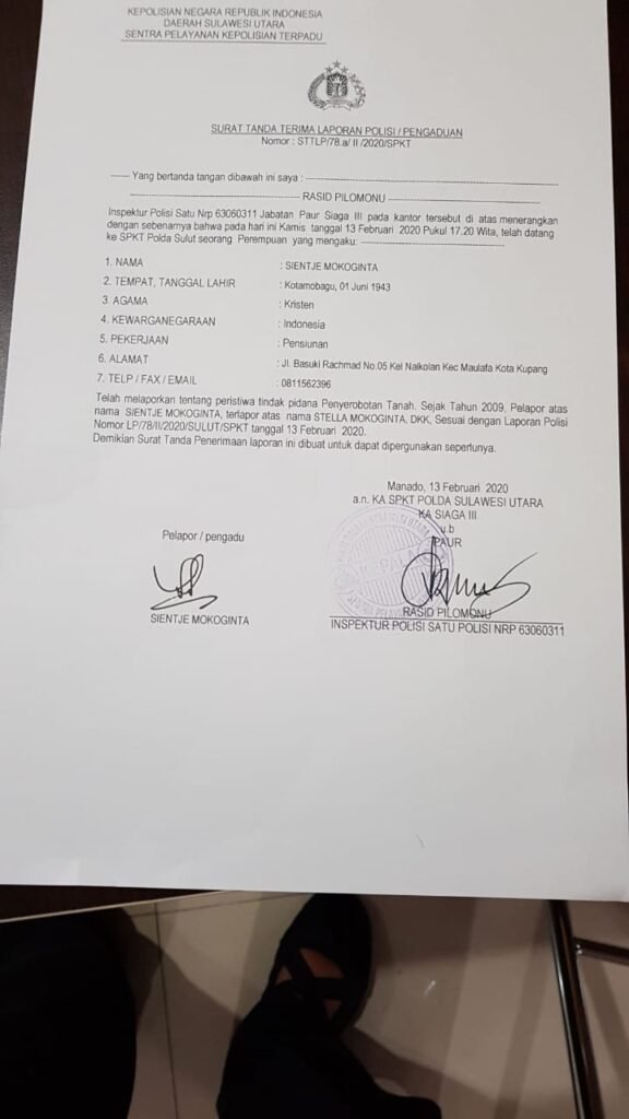 Manado – Portal24.id – Kasus dugaan penyerobotan tanah yang dilaporkan oleh Sientje Mokoginta di SPKT Polda Sulut dengan nomor LP/78/II/2020/SULUT/SPKT, tanggal 13 Februari 2020, tiba-tiba dihentikan penyidik Ditreskrimum Polda Sulut, berdasarkan Surat ketetapan Nomor : S.Tap / 54.a / XI / 2020 / Ditreskrimum tertanggal 9 November 2020.